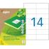 Boîte de 100 feuilles A4 d'étiquettes blanches recyclées multi-usages. Cette boîte en carton 100% recyclée et au film plastique recyclable contient 1400 étiquettes soit 14 étiquettes par feuille. Ces étiquettes imprimables mesurent 105 x 42,4 mm et possèdent des coins droits.