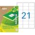 Boîte de 100 feuilles A4 d'étiquettes blanches recyclées multi-usages. Cette boîte en carton 100% recyclée et au film plastique recyclable contient 2100 étiquettes soit 21 étiquettes par feuille. Ces étiquettes imprimables mesurent 63,5 x 38,1 mm et possèdent des bords arrondis.