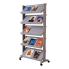 Présentoir avec structure métal coloris aluminium avec profil en polystyrène 100% recyclable, équipée de 4 roulettes pivotantes. 5 Tablettes injectées en polystyrène avec rebord 4 cm pour tout document A4. Largeur 85,5 cm pour 3 documents de face -Dimensions utiles L. 78 cm. Tablettes réglables tous les 2 cm et orientables à 0°,45° et 75°.