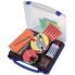 dim. coffre: (L)345 x (P)310 x (H)60 mm, couleur: bleu/trans -parent, contenu: rectangles, cercles, points de marquages, marqueurs, ciseaux, punaises, pointeur laser (class 2) (UMKM)