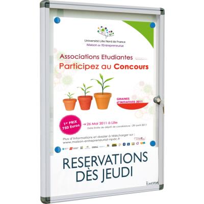 Porte battante en plexiglas épaisseur 3 mm. Cadre en aluminium anodisé avec coins arrondis. Épaisseur 3,3 cm. Ventilation contre la condensation. Fond en métal laqué pour affichage par punaises aimantées. Serrure -livrée avec 2 clés.