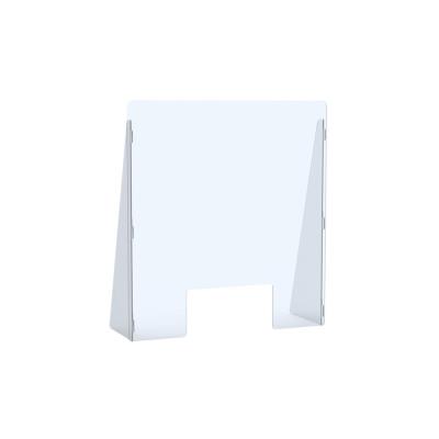 Cette vitre de protection empêche le contact direct avec le public et prévient donc la transmission de bactéries. La petite ouverture permet le passage de documents. Ce panneau séparateur est en Plexiglass -PMMA et épais de 4 mm. Sa transparence, son aspect visuel et sa résistance aux rayures font que le PMMA peut être considéré comme une alternative légère au verre. Piétement en polystyrène choc. Facile à installer, assemblage du pied par simple emboîtement et fixation par adhésif double face. Résiste aux produits désinfectants -eau de javel, gel hydroalcoolique, lingettes nettoyantes....