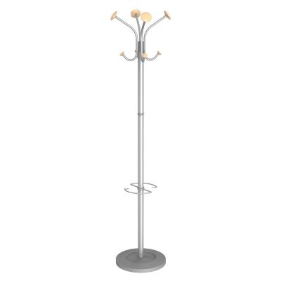 Ce portemanteau se compose d'une tête avec 4 patères-galets en bois et 4 patères-crochets, d'un porte-parapluies, d'une coupelle de récupération d'eau amovible et d'une base lestée en métal.