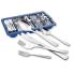 18/10, poli fin, épaisseur du matériel: 2,2 mm Contenu: 36 couteaux à menu, 36 cuillères à menu, 36 fourchettes à menu, 36 cuillères à café, 36 fouchettes de cuisine, 1 récipient en plastique pour le couvert (204-059)