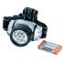 sous blister, 3 modes d'éclairage: 1, 3 ou 7 LED, tête de lampe orientable verticalement, ajustable à toutes les tailles de tête grâce au bandeau élastique, couleur: argent/ noir, dimensions: (L)172 x (P)122 x (H)86 mm, étanche, (M30640) avec 3 piles AAA