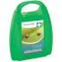 Boîte en plastique PP, couleur: vert, étiquette devant et derrière, pratique pour les déplacements, contenu protégé contre les éclaboussures, dimensions: (L)100x(P)30x(H)140 mm poids: 68 g (REF 51008) Contenu: 2 x compresses 50 x 50 mm stériles, 4 x tampons alcoolisés, 1 x pince à tiques, 1 x ensemble de pansements pour équipement normalisé