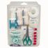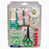 Le lot comprend : 10 compresses stériles 5 x 5 cm, 3 sachets anti-brûlures, 4 bandes extensibles 3 m x 7 cm, 3 sachets de gel bactéricide, 1 pansement compressif stérile petit modèle, 1 paire de ciseaux 10 cm, 1 pansement compressif stérile grand modèle, 1 pince à échardes, 20 pansements adhésifs assortis en 3 tailles, 12 épingles de sûreté, 1 rouleau de sparadrap de 5 m, 2 paires de gants en vinyle, 1 vaporisateur 50 ml de chlorhexidine, 1 doigtier en cuir, 3 compresses anti-coups au calendula, 1 guide de premiers secour