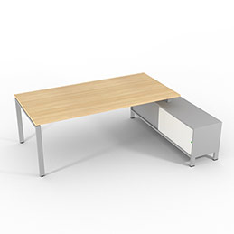 Bureau de direction sur retour porteur gamme RIO - 220 x 165 cm - plateau mélaminé chêne clair - piètement gris aluminium - portes blanches