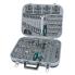 dans un coffret à outils avec cadre en aluminium, poids: 9,5 kg, outils en acier au chrome vanadium, couleur du coffret: gris foncé (98450) contenu: 2 x clé à cliquet réversible / 4 x rallonge, 2 x poignée en T / 2 x cardan universel / 2 x adaptateur d'embouts / 2 x poignée / 32 x douilles / 148 x embouts / 1 x réducteur / 2 x clé à bougie / 10 x clé à douilles / 6 x douilles en E / 11 x clé mixtes / 8 x clé à ergot