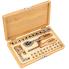 dans une mallette en bambou, contenu: 1x cliquet réversible, 1x poignée à vis, 10x douille, 1x rallonge, 20 embouts, 1x adaptateur d'embout, 7x clé à six pans creux, mallette avec manchon de papier (M29000)