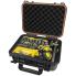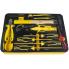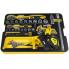 contenu: 2x cliquet réversible, 2x rallonge, 1x joint de cardan, 9x clé Allen, 18 douille, 20x embout de tournevis, 1x clé à mollette, 1x arc de scie domestique avec lame en métal, (M29063) 1x porte-embout à changement rapide, 1x couteau universel + 10 lames de rechange, 1x pince pour pompe à eau, 1x pince coupante, 1x pince pour téléphone, 1x marteau de serrurier, 1x testeur de tension, 4x tournevis d'atelier, 1x mètre ruban en acier, 1x adaptateur d'embout