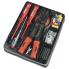 dans une boîte en plastique avec couvercle transparent, dimensions: (L)286 x (P)180 x (H)32 mm, couleur: rouge/noir poids: 520 g (M00208) Contenu: 11x gaines thermorétractables, 2x tournevis d'électricien, 65x cosses isolées & non isolées, 1x pince à sertir 200 mm, 1x ruban adhésif universel, 1x testeur éclairage auto 6 - 24 Volt (ne convient pas pour 230 Volt), 1x câble de branchement pour le testeur