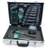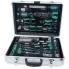 108 pièces dans un coffret en aluminium, contenu: 30 embouts, 20 douilles, 9 clés à six pans, 8 clés à anneau, 1 x cliquet reversible, 8 x tournevis, 1 marteau, 1 mètre ruban, 1 x scie à métaux, 6 x lame de rechange pour la scie, 1 x Cutter, 10 x lame de rechange (29075) 5 pinces, 1 lime, 1 détecteur de tension, 2 rallonges, 1 porte-embout