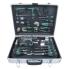 composé: de 6x tournevis / 2 x tournevis de précision / 1 x testeur de tension / 1 x manche / 1 x cliquet / 2 x rallonges / 1 x clé à bougies / 17 x douilles / 2 x adaptateur / 61 x embouts (29072) 1 x pince multiprise / 1 x pince universelle / 1 x pince à sertir / 1 x clé à fourche / 8 x clé Allen / 1 x scie à métaux avec 6 lames / 1 x coffret en aluminium