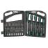 dans une malette en plastique, en acier CV, dimensions: (L)304 x (P)240 x (H)62 mm, couleur: vert / noir (M11247) Contenu: 9x tournevis, 9x douilles, 1x poignée en T, 27x embouts (25 mm), 1x adaptateur pour embouts