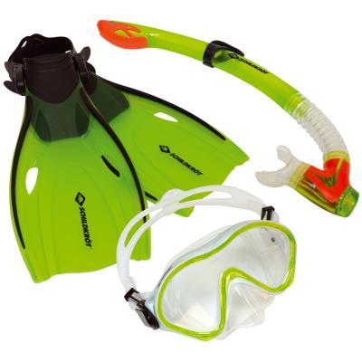 tuba: embout buccal en silicone, porte-tuba réglable, masque en verre de sécurité, corps du masque en silicone, palmes de forme anatomique, système de boucles, couleur: vert clair, contenu: tuba, masque et palmes (940001)