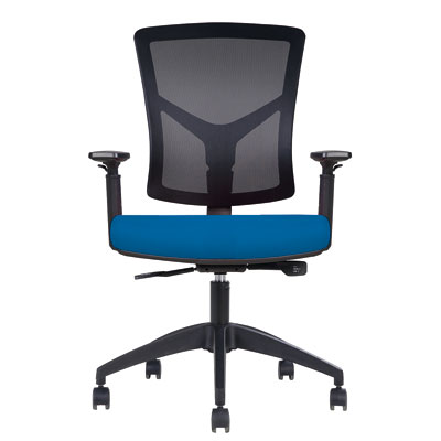 Siège synchrone 4 positions - Structure Noire - Dossier en résille Noire - Assise en Tissu Bleu - Réglage automatique de la tension - Accoudoirs 1D inclus - 5/8h - Garantie 5 ans