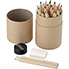 Comprenant dans une boite en carton 24 crayons de couleur, gomme et taille crayon. Marquage indisponible sur les composants. Papier.